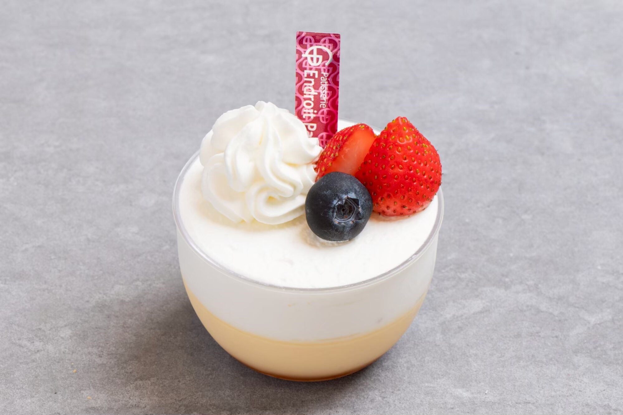 キャラメルマスカルポーネクリーム、ベリーソース、生クリーム、キャラメルソース、パイクラム