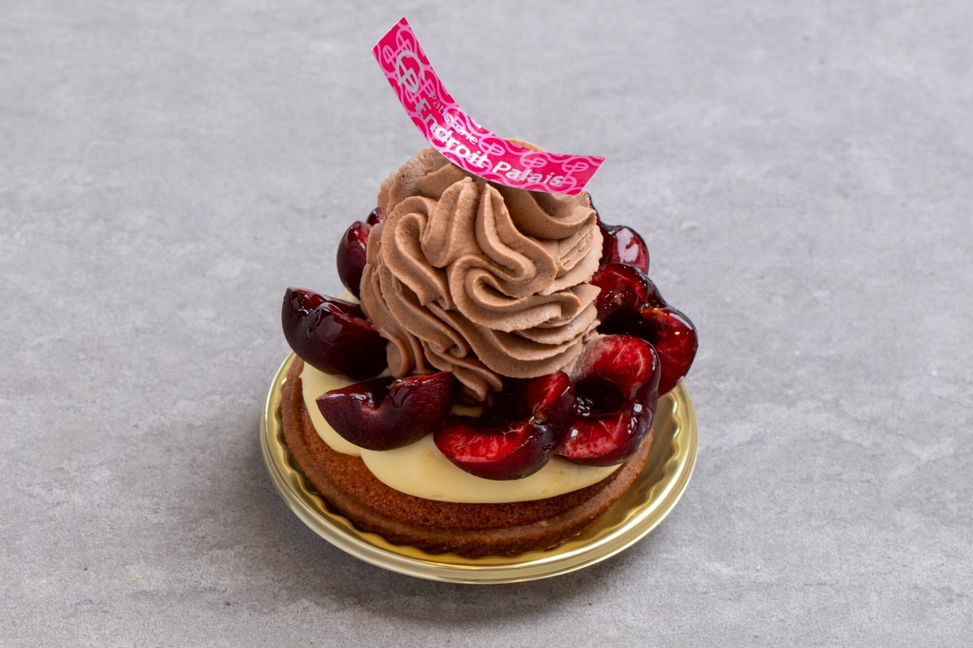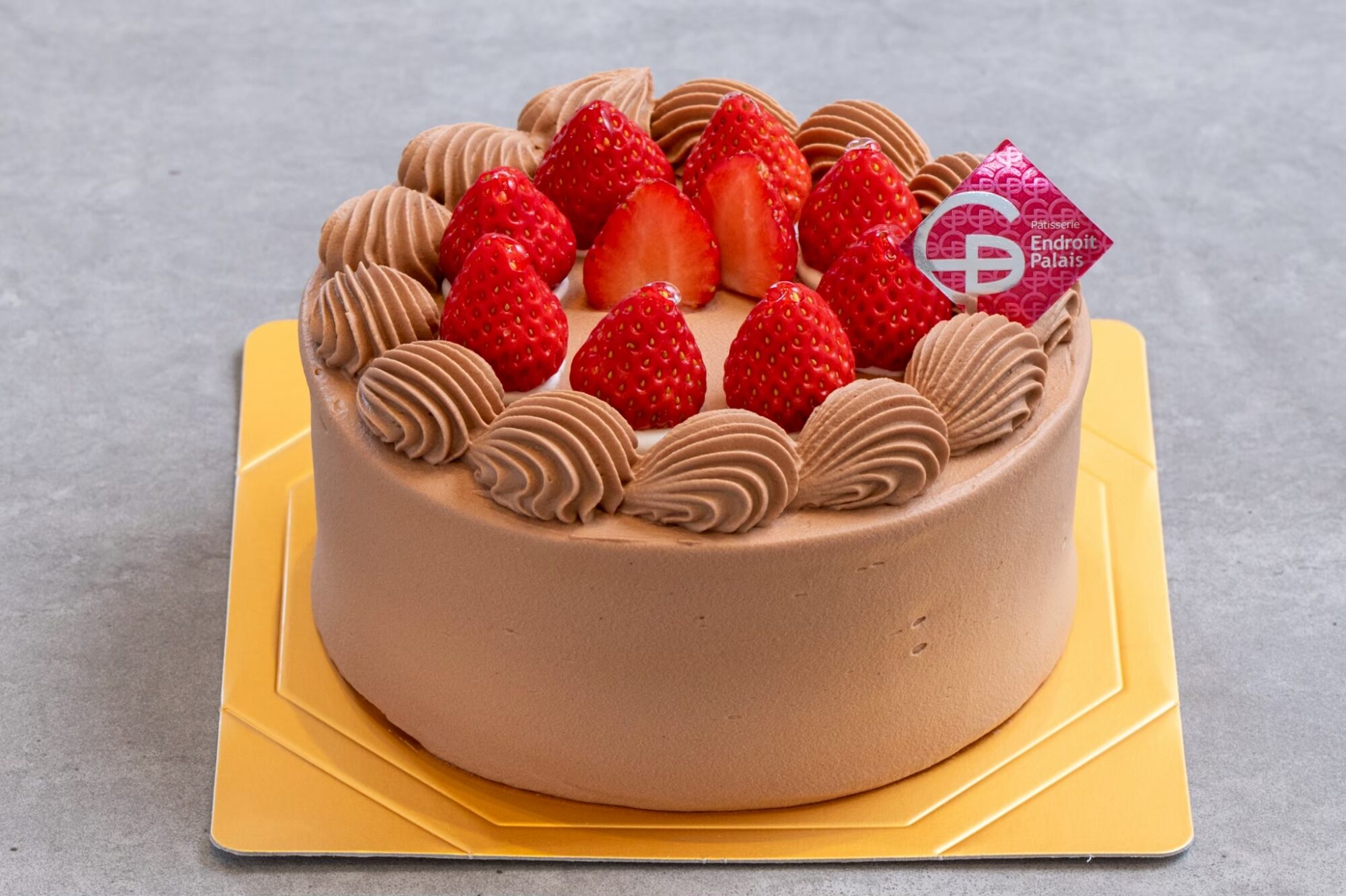 生クリームとベルギーチョコレートを合わせたショコラクリームに、ココアスポンジ、苺、苺ソースを合わせました。