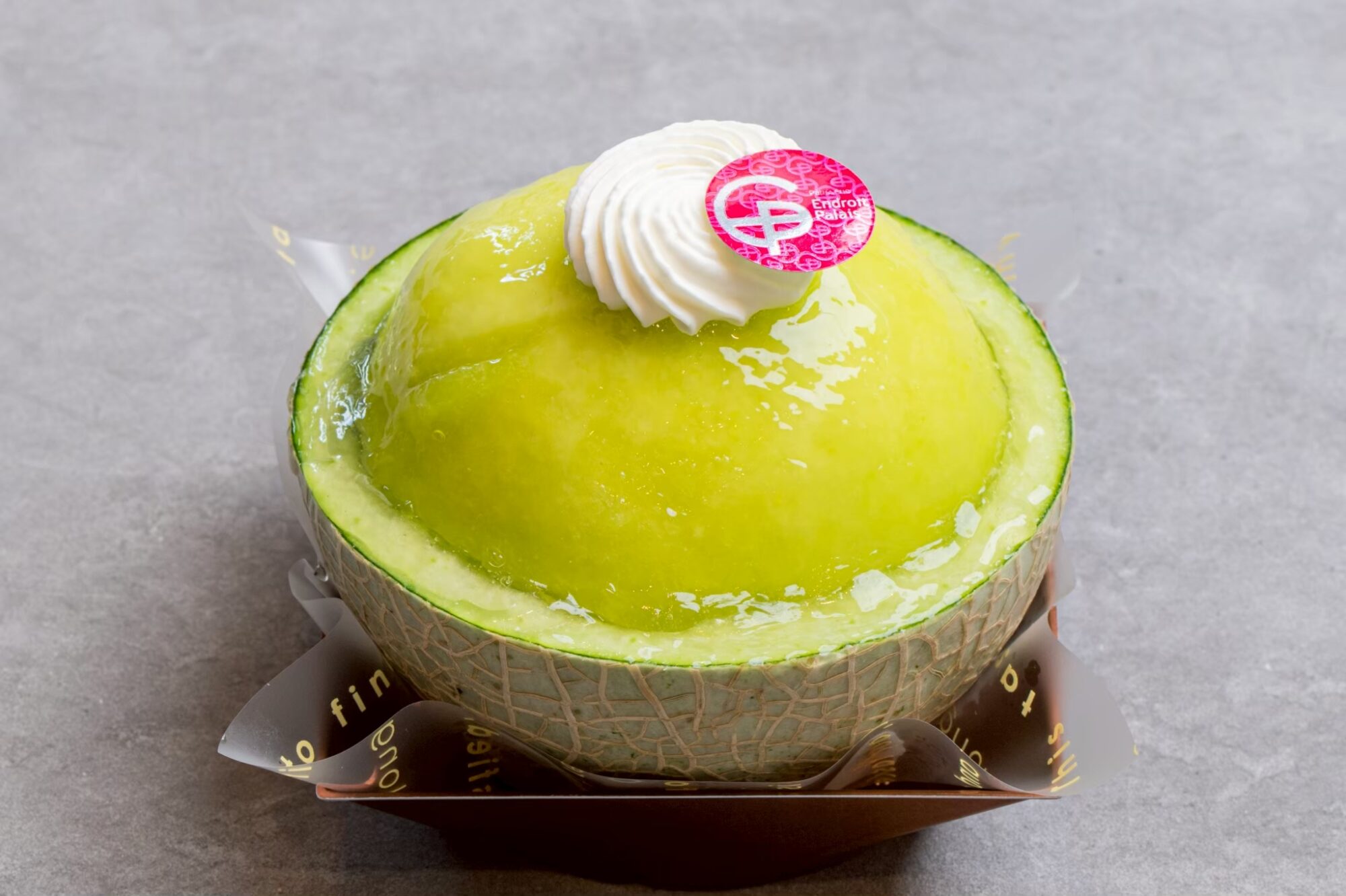 メロンを丸くくり抜き、プリン、生クリーム、カスタードクリーム、スポンジと合わせました。